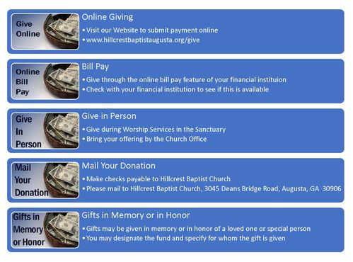You may also mail checks payable to Hillcrest Baptist Church to PO Box 9839 Augusta, GA 30916-0839.